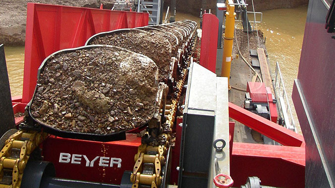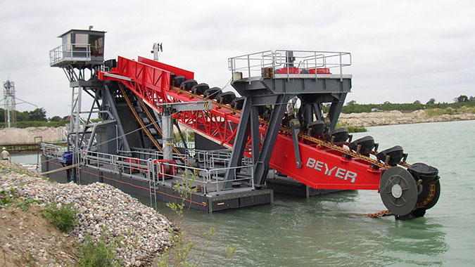 Wir bieten Ihnen Eimerkettenbagger als landgestützte oder schwimmende Anlagen.